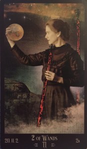 And so, in its upright or balanced position on the spectrum, the 2 of Wands is standing at the threshold, considering the initiative to go beyond what we’ve been comfortable with and allowing ourselves to explore new territory; to reach out; to set goals; sending out our ships, sharing something of ourselves with the outside world. We may be confronted with a choice between inner emptiness and outer fulfillment; between action and inaction. Will we forge a new path or choose to risk nothing?