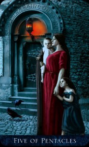And so the centered position of the Five of Pentacles presents a challenge in the material world — of health, of home, of finances, of our spiritual path. The security we felt in the four is gone and this uncertainty is a reminder to not be afraid to ask for assistance or sanctuary when we need it. You can’t have it if you can’t ask for it.