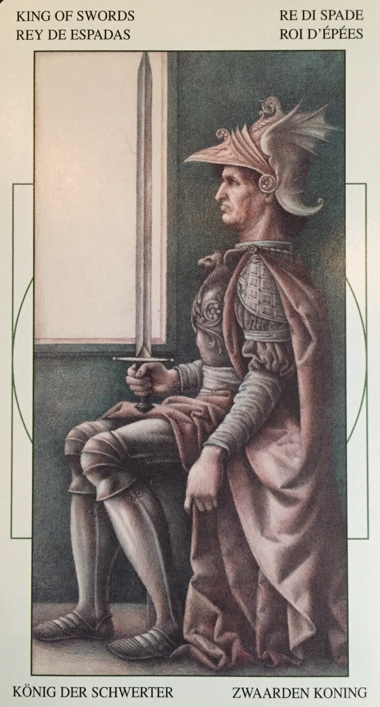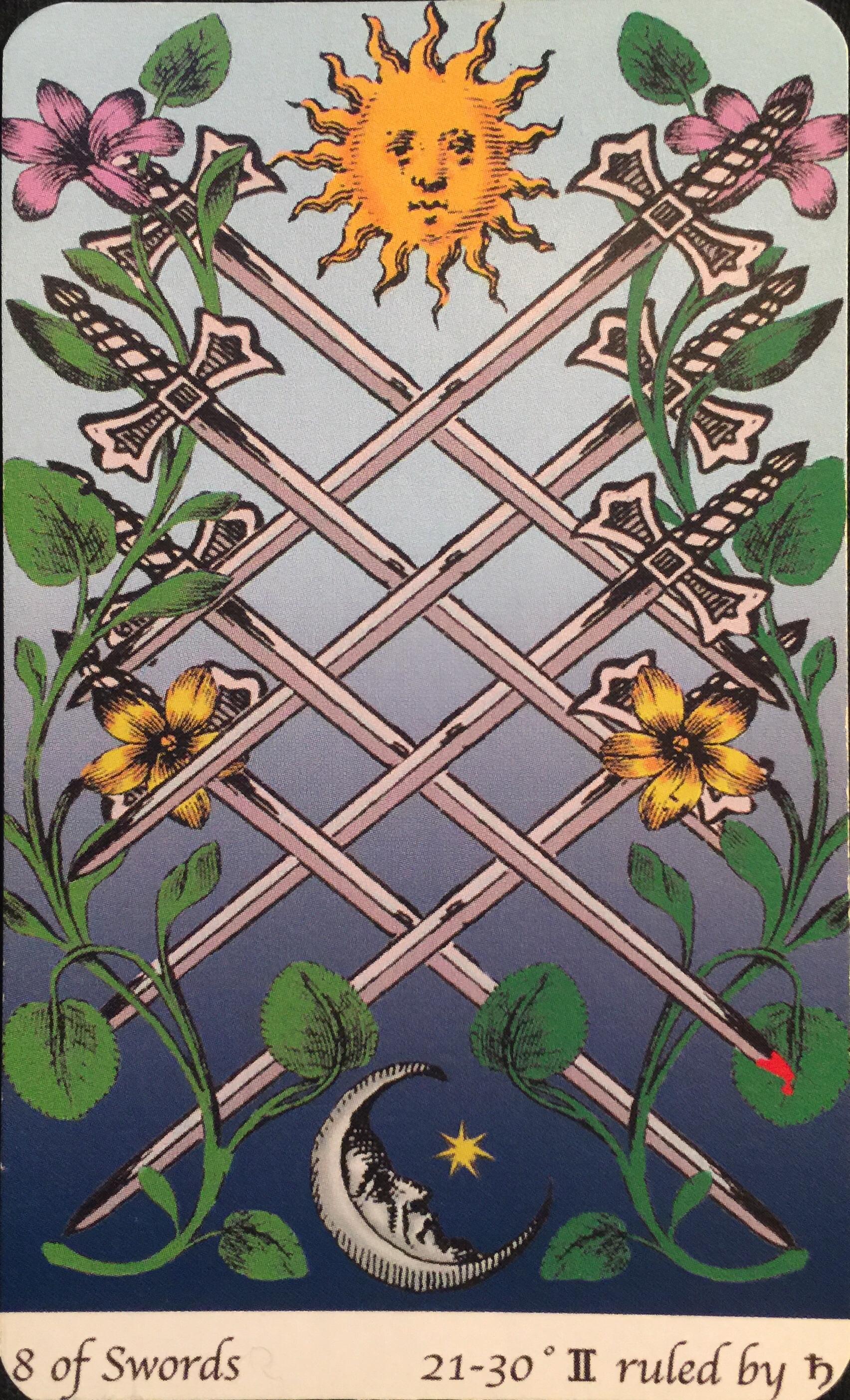 In the Pips, a single sword pushes its way up and out through the barrier of 8 interwoven swords. It’s a card of victory, but by pushing through; by having the courage to push through them.