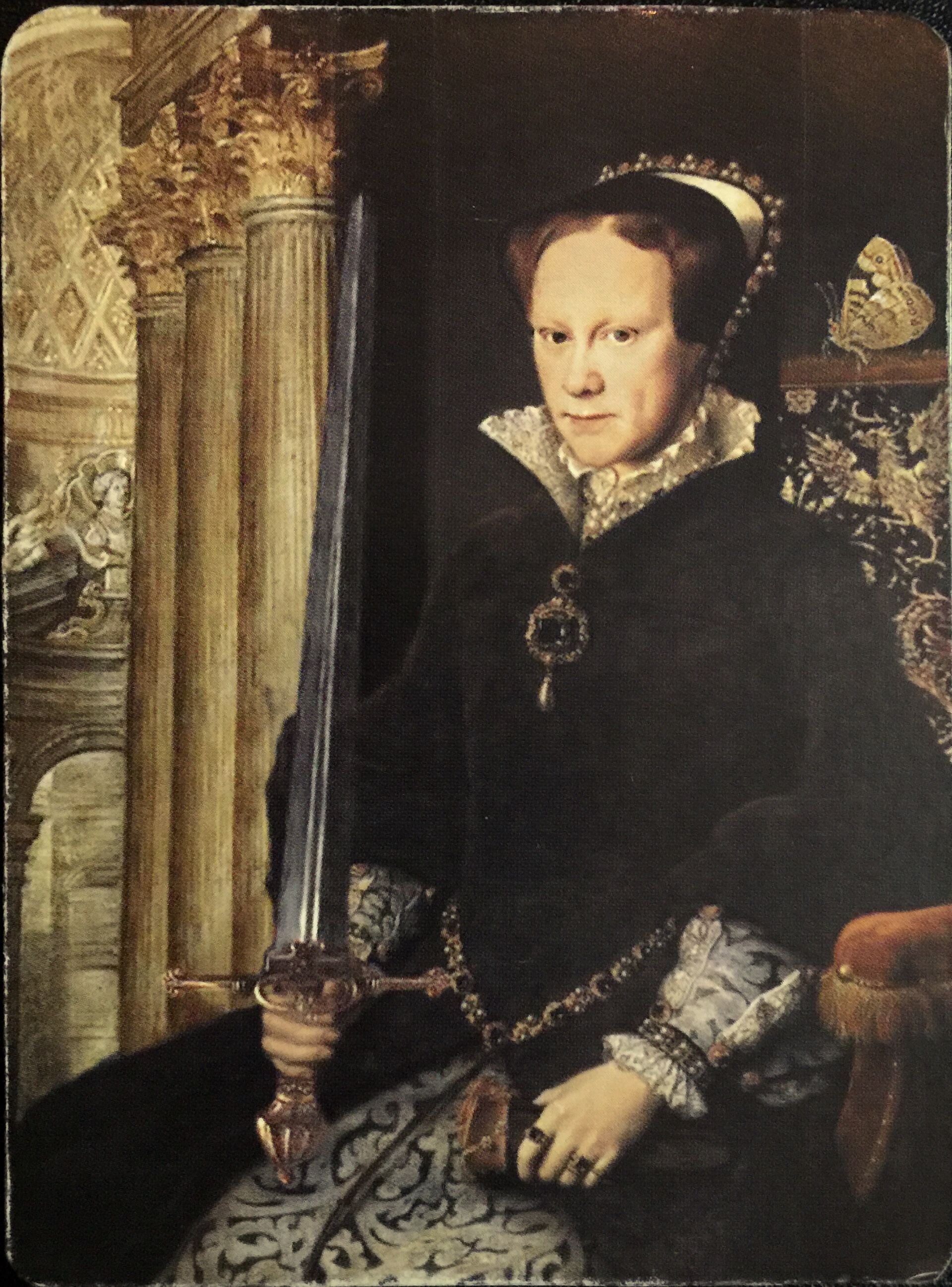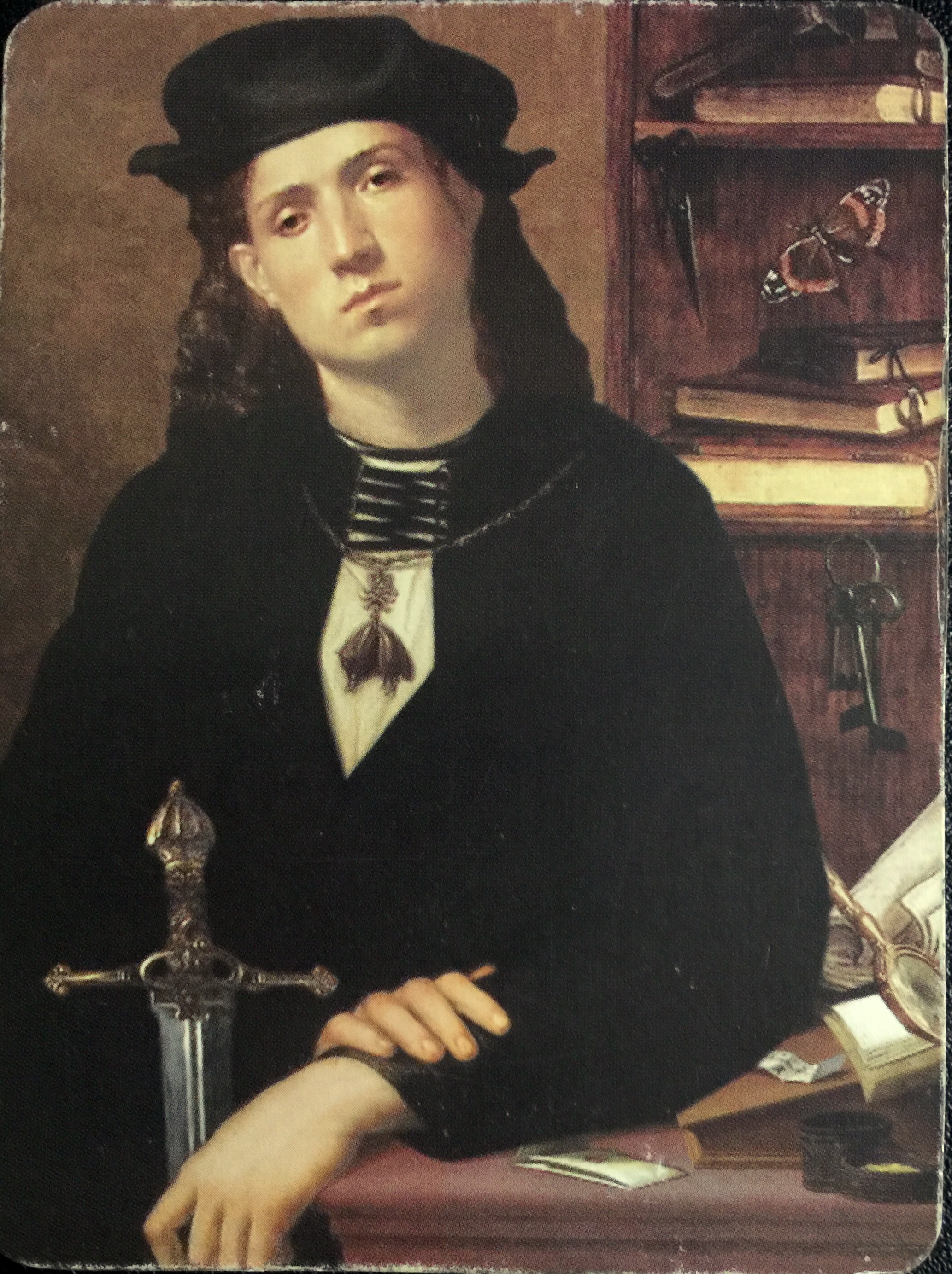 Pamela Coleman Smith was probably pulling from Romeo & Juliet for her depiction; the carved scene perhaps a nod to Act IV scene III, where a distraught Juliet sees the struggle which ends with Romeo killed “upon a rapier’s point.”